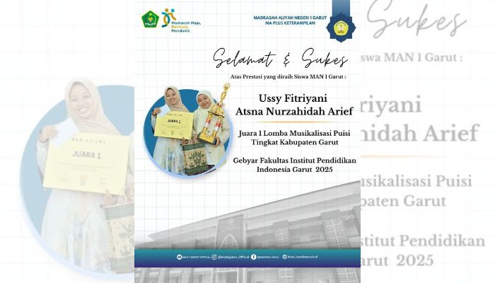 WARTAGARUT.COM – Kebanggaan kembali dirasakan oleh keluarga besar MAN 1 Garut. Dua siswi berbakat, Ussy Fitriyani dan Atsna Nurzahidah Ariefman, berhasil menyabet Juara 1 dalam ajang Lomba Musikalisasi Puisi Tingkat Kabupaten Garut yang diselenggarakan dalam rangka Gebyar Fakultas Institut Pendidikan Indonesia (IPI) Garut 2025.