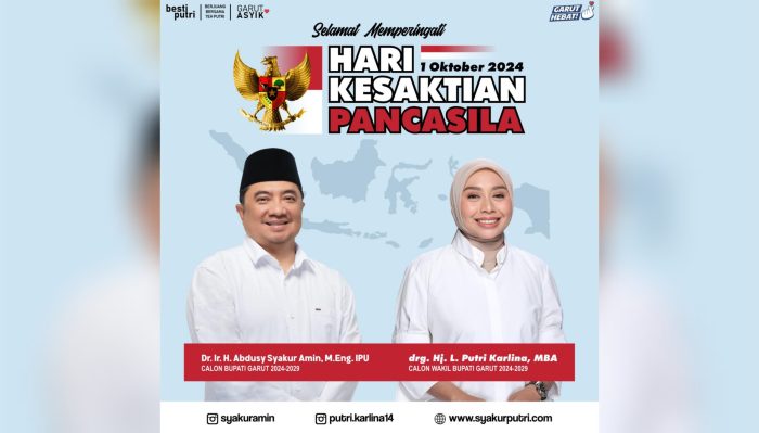 WARTAGARUT.COM– Pasangan calon (Paslon) Bupati dan Wakil Bupati Garut nomor urut 2, Syakur Amin dan Putri Karlina (SANTRI), turut mengucapkan Selamat Hari Kesaktian Pancasila dengan tema “Bersama Pancasila Kita Wujudkan Indonesia Emas”.