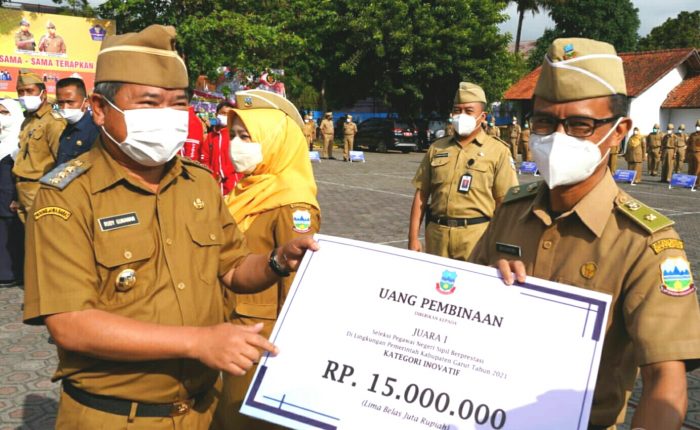 Pemerintah Kabupaten (Pemkab) Garut memberikan penghargaan kepada Pegawai Negeri Sipil (PNS) Berprestasi di Lingkungan Pemkab Garut. Bupati Garut, Rudy Gunawan menyerahkan langsung kepada para juara bersamaan dengan pelaksanaan apel pagi gabungan terbatas, di Lapangan Sekretariat Daerah (Setda), Jalan Pembangunan, Kecamatan Tarogong Kidul, Kabupaten Garut, Senin (25/10/2021).